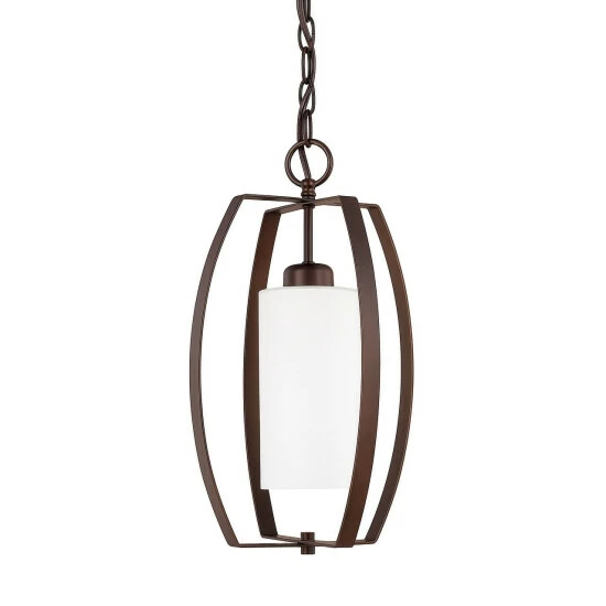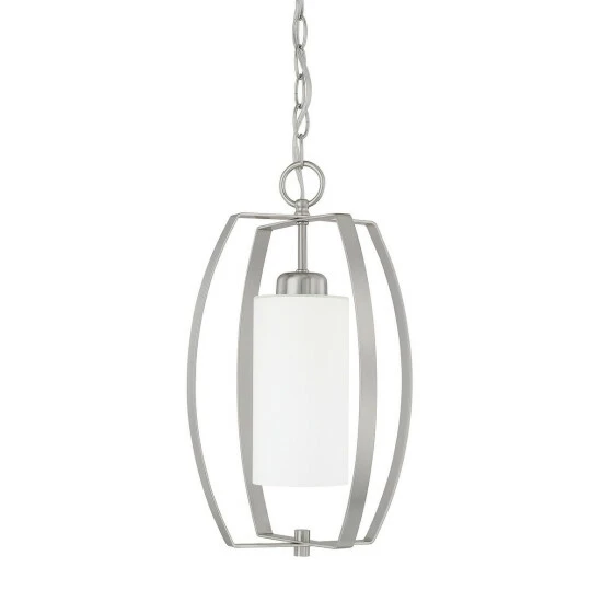 This 1-light hanging foyer pendant is available in a brushed nickel or bronze finish that will complement many transitional and traditional decors throughout your home. The clean lines of the steel frame add interest while the soft white glass shade softens the light creating a warm ambiance for many spaces.
