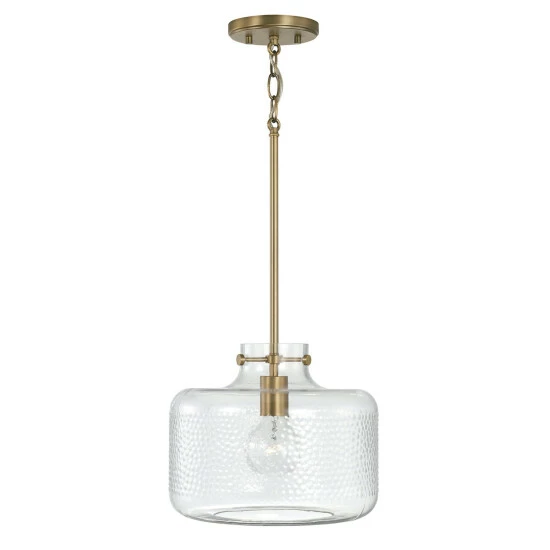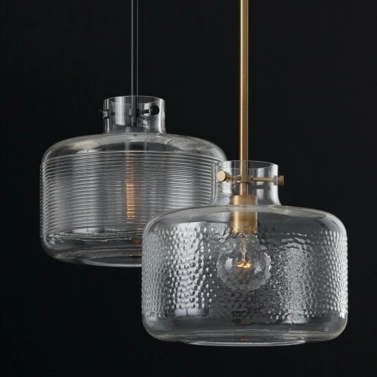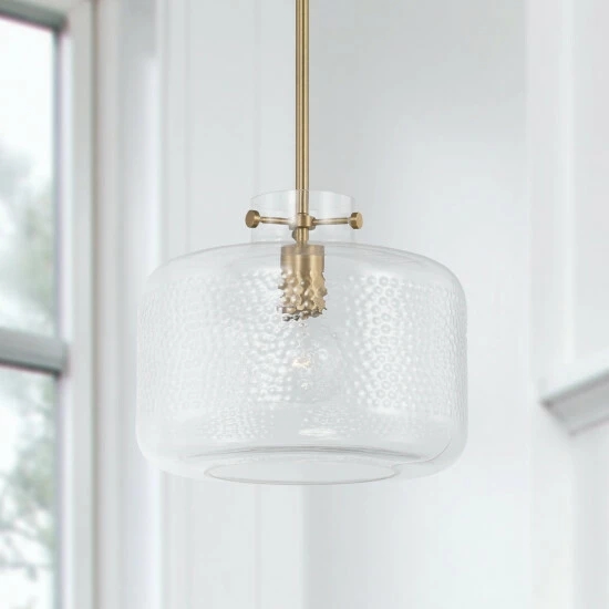 The unique pebble detailing of the glass cloche on the 1-ight hanging pendant gives an artisan touch to the classic silhouette.