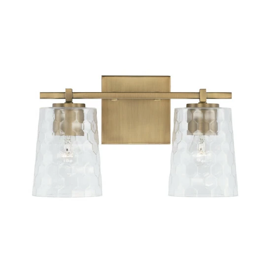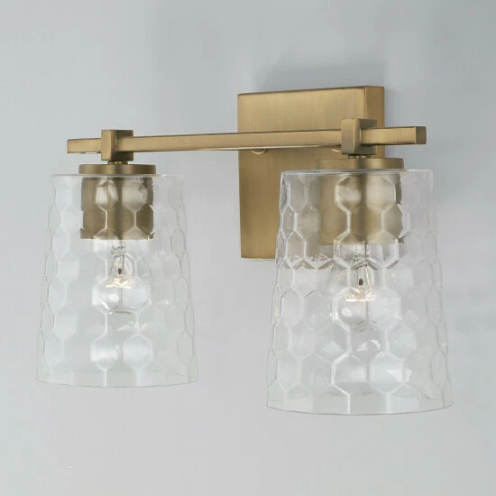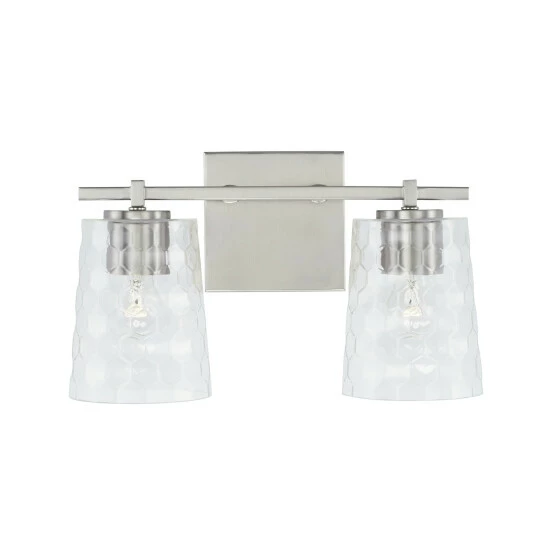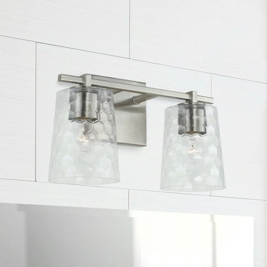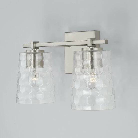 The clean lines of the finish anchor the tapered honeycomb glass in the 2-light vanity for a sophisticated style. This fixture is available as a 2-light, 3-light or 4-light.