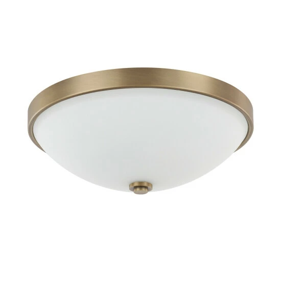 This 2-light flush mount fixture features an aged brass finish that will complement many traditional decors. The soft white glass bowl softens the light creating an inviting atmosphere and completes this simple yet functional design.