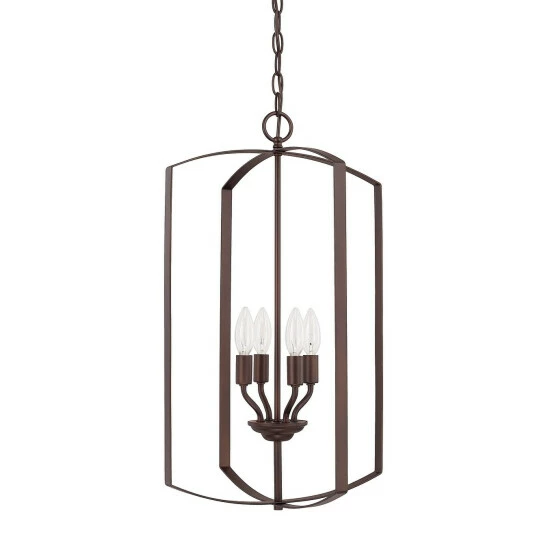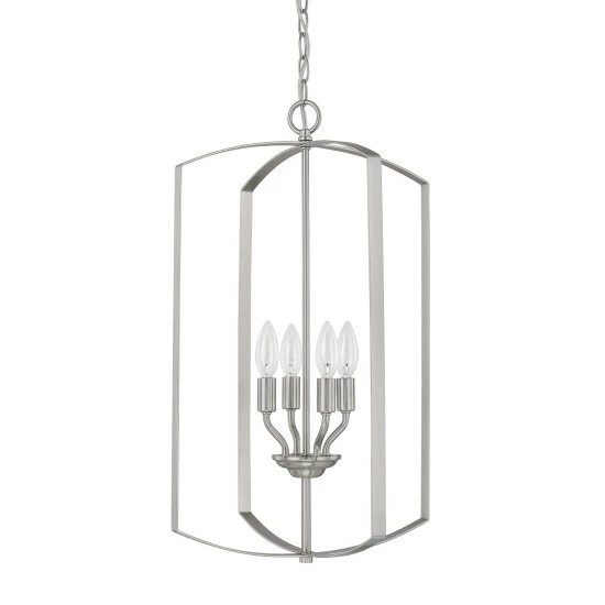 This 4-light hanging foyer pendant is available in a brushed nickel or bronze finish that will complement many transitional and traditional decors throughout your home. The clean lines of the steel frame add interest while the exposed bulbs provide ample light to many spaces.