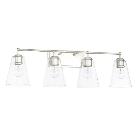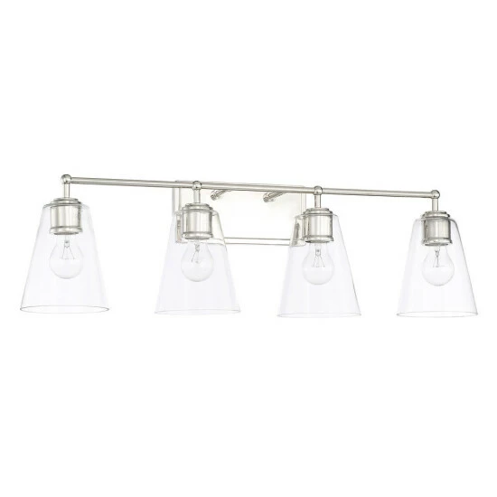 This 4-light bath/vanity light features a polished nickel finish that will complement many transitional decors. The clean lines of the steel frame add interest while the clear glass shades provide ample lighting to any space.