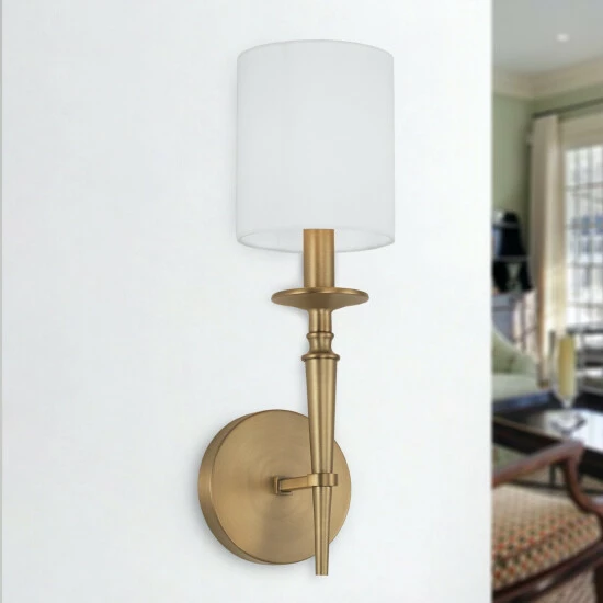 - Applications: Rated for dry locations, perfect for a hallway/stairway, foyer/entryway, kitchen, home office, dining room, living room or bedroom. Graceful, sophisticated Aged Brass or Polished Nickel curves highlighted by white fabric stay-straight shades.