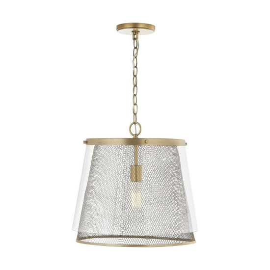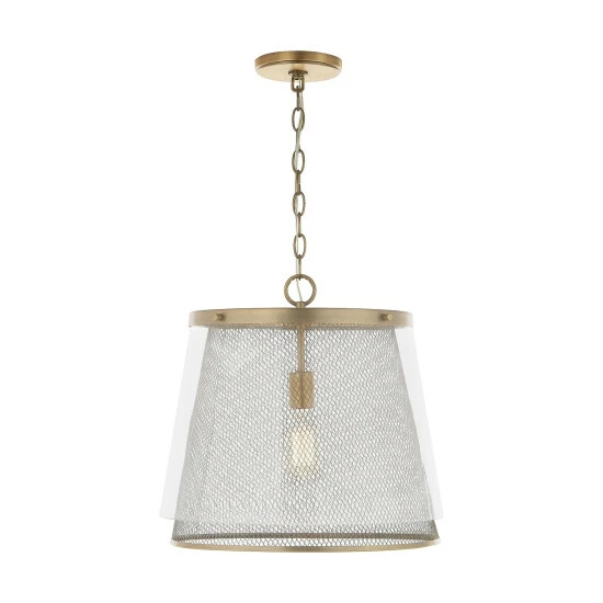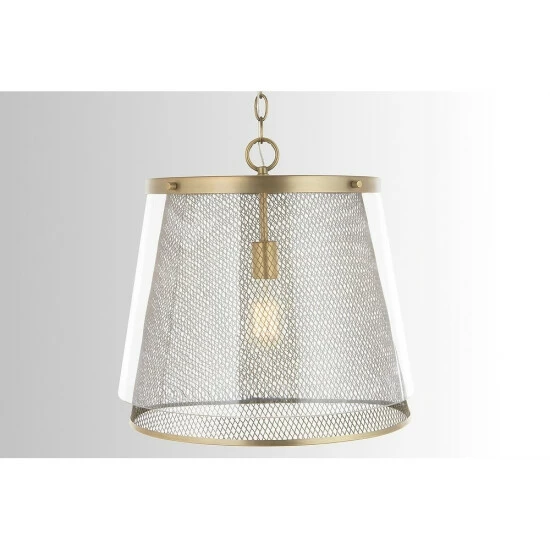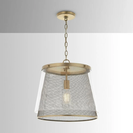 This 1-light hanging pendant from the Abbott collection features an aged brass finish that will complement many mid-century, contemporary, and transitional decors throughout your home. The combination of the metal mesh and clear glass shades add interest enhancing many spaces.
