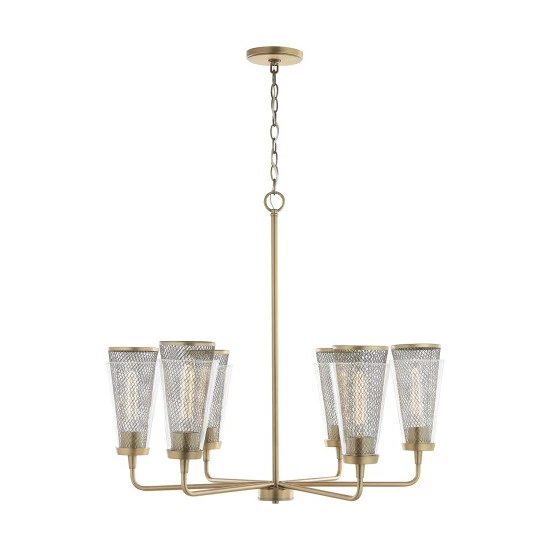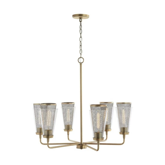 This 6-light chandelier from the Abbott collection, features an aged brass finish that will complement many mid-century, contemporary, and transitional decors throughout your home. The combination of the metal mesh and clear glass shades add interest enhancing many spaces.