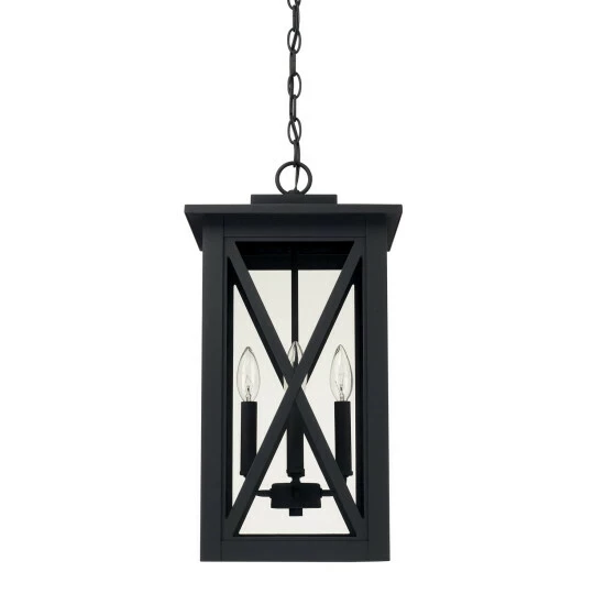 This Avondale collection 4-light outdoor hanging lantern features a black finish that complements many transitional outdoor decors. Crisp lines, straight silhouettes and Clear glass punctuated by crisscrossing frames separate the Avondale outdoor hanging lantern from the crowd. Crafted of durable materials, this exterior hanging lantern stands up to harsh weather and UV rays; it is warrantied to resist fading and rust for five years.