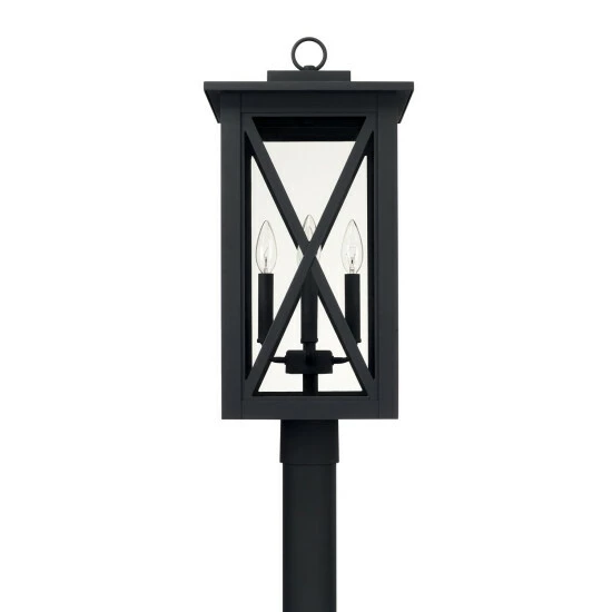 This Avondale collection 4-light outdoor post mount features a black finish that complements many transitional outdoor decors. Crisp lines, straight silhouettes and Clear glass punctuated by crisscrossing frames separate the Avondale 4-light post-top lantern from the crowd. Crafted of durable materials, this exterior wall lantern stands up to harsh weather and UV rays; it is warrantied to resist fading and rust for five years.