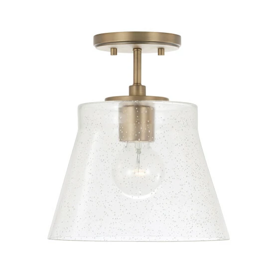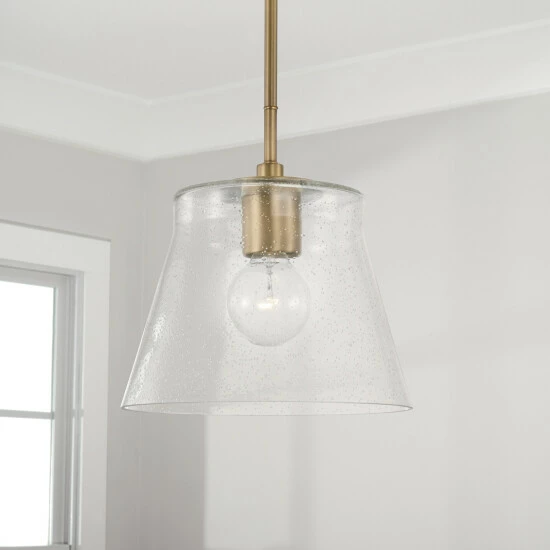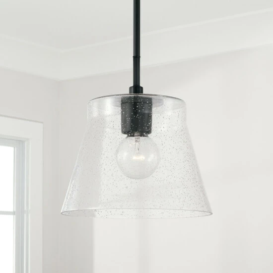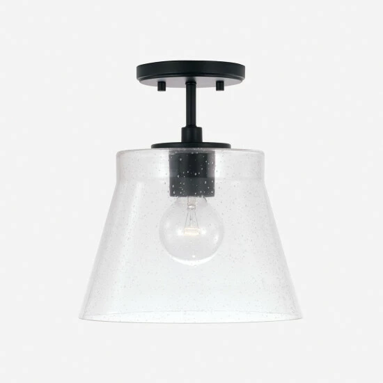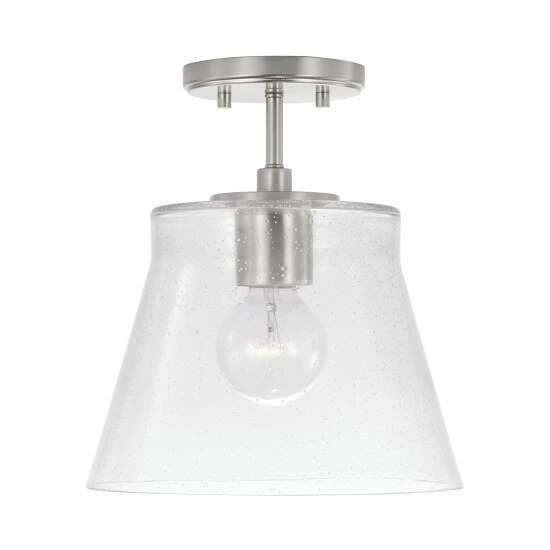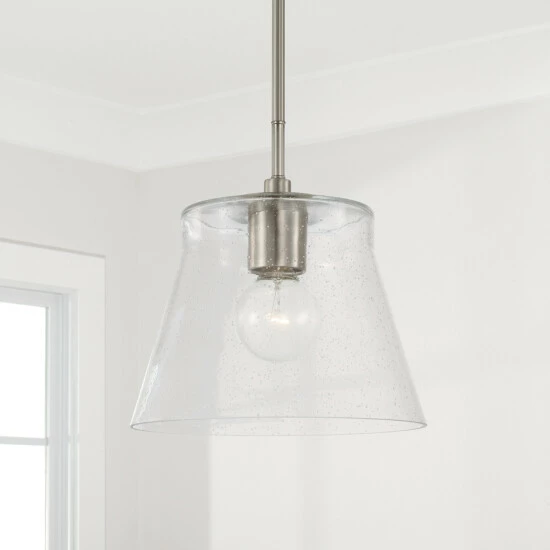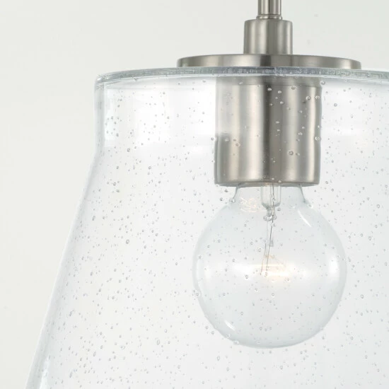 - Applications: Can be used as a pendant or semi-flush. Simple and sleek silhouette paired with clear, seeded glass in a tapered form. Available in three finishes for maximum versatility.