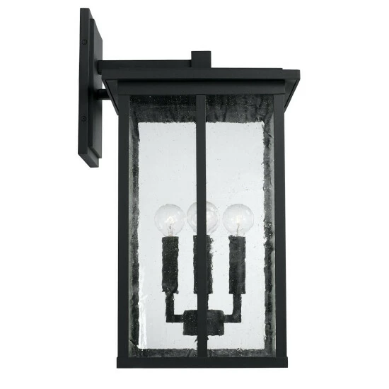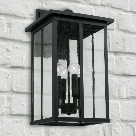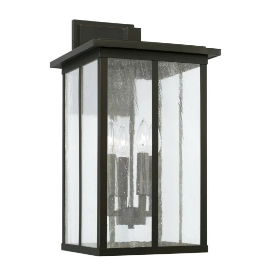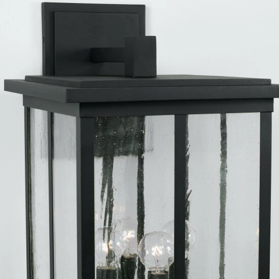 Clean lines and framed edges in the Barrett Collection give a graphic punch without being too overpowering. The textured water glass diffuses light and emits a warm glow for your porch or patio. These fixtures are part of our Rain or Shine Collection and are backed by our five-year warranty.