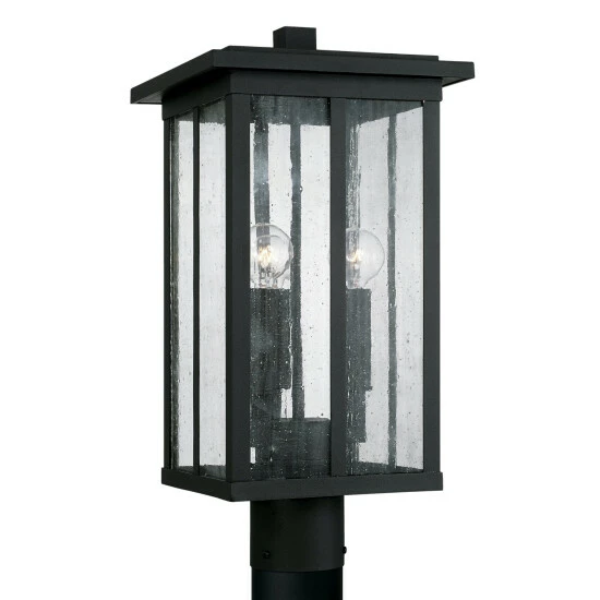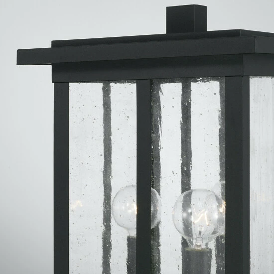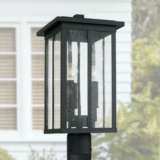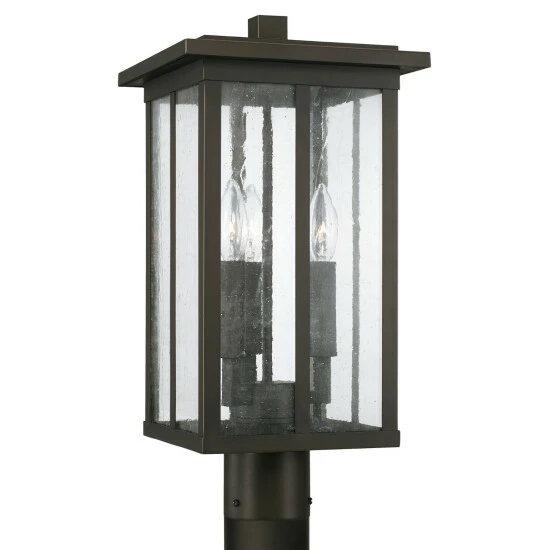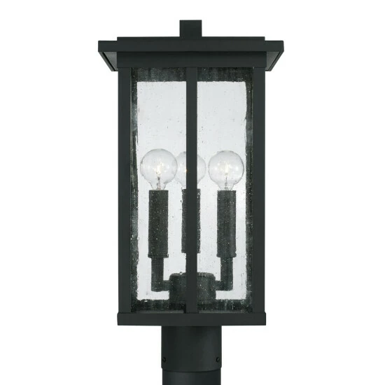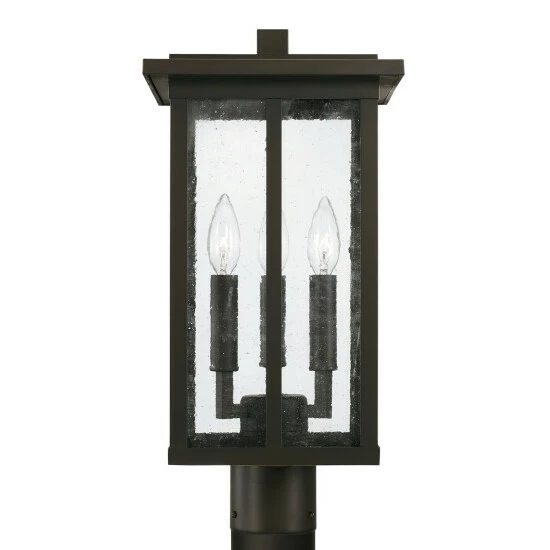 Clean lines and framed edges on the Barrett collection 3-light outdoor Post Lantern give a graphic punch without being too overpowering. The textured water glass diffuses light and emits a warm glow for your porch or patio. This fixture is part of our Rain or Shine Series and are backed by our five-year warranty.