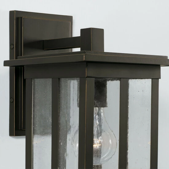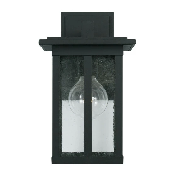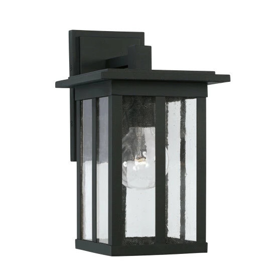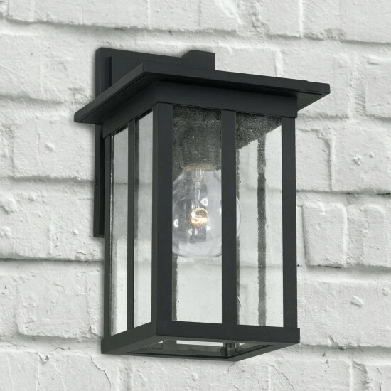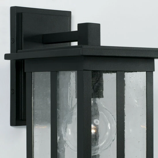 Clean lines and framed edges in the Barrett Collection give a graphic punch without being too overpowering. The textured water glass diffuses light and emits a warm glow for your porch or patio. These fixtures are part of our Rain or Shine Collection and are backed by our five-year warranty.