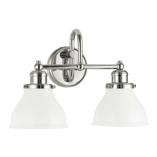This Baxter collection 2-light vanity/bath light features a polished nickel finish that will compliment many urban, retro, loft and transitional decors. The milk white glass shades soften the light and complete the look.