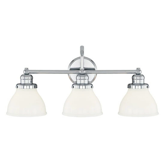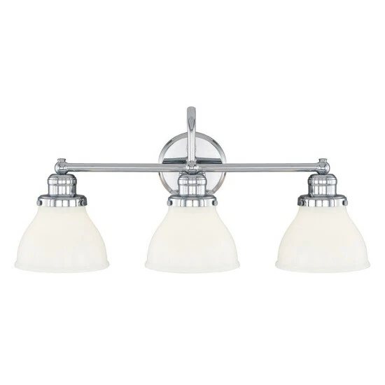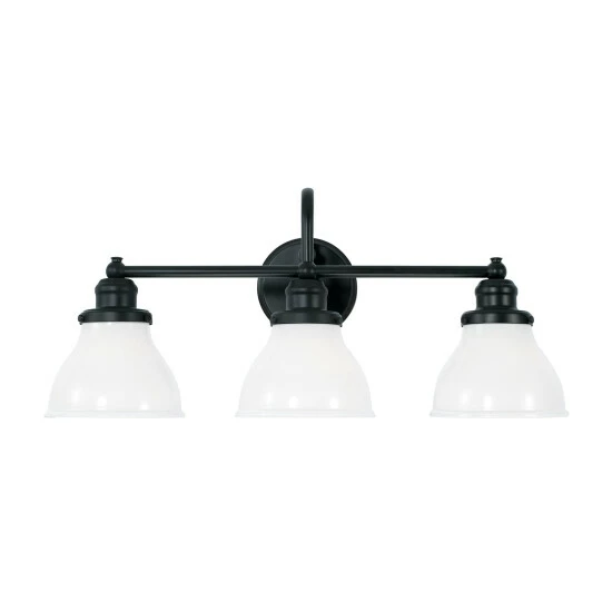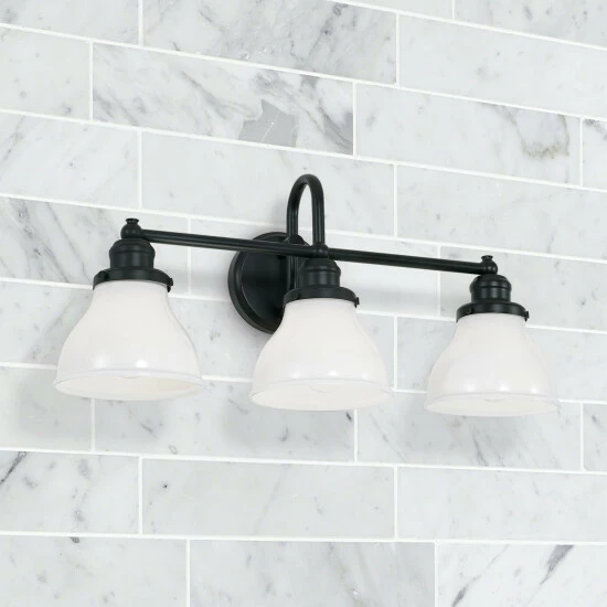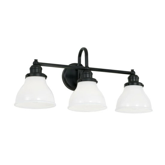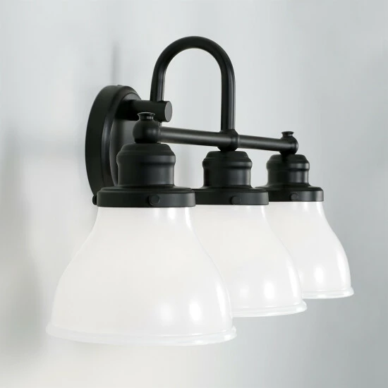 Featuring cloche-style milk glass shades, the Baxter 3-light vanity brings tasteful illumination to your bath. Its clean profile is marked by a centrally positioned, u-shaped arm and a straight rod, conveying industrial inspiration.