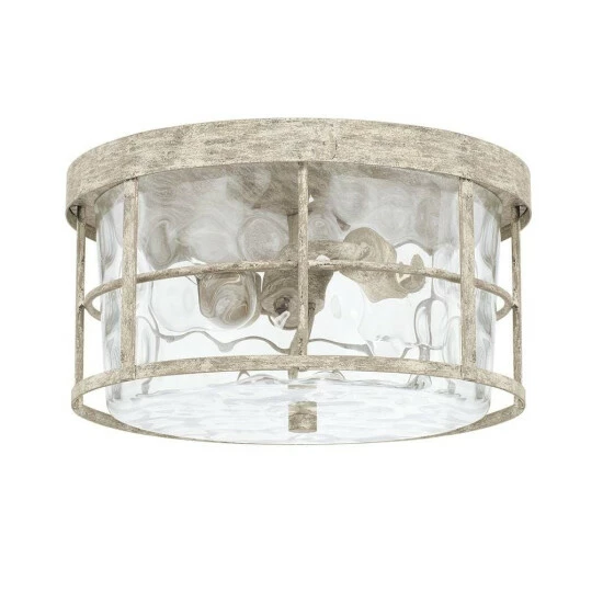 This Beaufort collection 2-light flush mount fixture features a beautifully hand painted mystic sand finish that will complement many coastal and transitional decors throughout your home. The clean lines of the frame add interest while the water glass will give a unique look to the light that will brighten up many spaces.