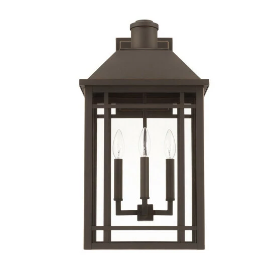 This Braden collection 3-light outdoor wall lantern features an oiled bronze finish that complements many transitional outdoor decors. A hint of craftsman character and a touch of industrial detail pair seamlessly in this Braden wall lantern. Mission style design featuring a straight profile and clean lines comes alive in this fixture, perfect for illuminating the front porch, patio or deck with distinctive yet timeless style. These outdoor wall lanterns are crafted of durable, non-corrosive materials warrantied for five years to resist rusting and fading.