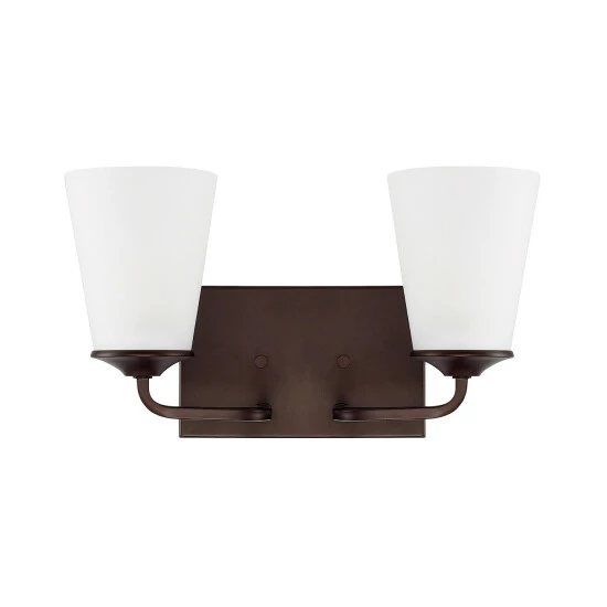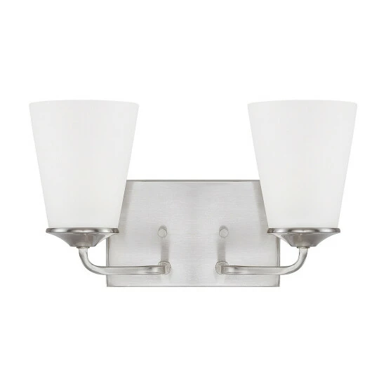 This 2-light bath/vanity light from the Braylon collection is available in a brushed nickel or bronze finish that will complement many transitional and traditional decors throughout your home. The clean lines of the steel frame add interest while the soft white glass shades soften the light creating a warm ambiance for many bathroom spaces.