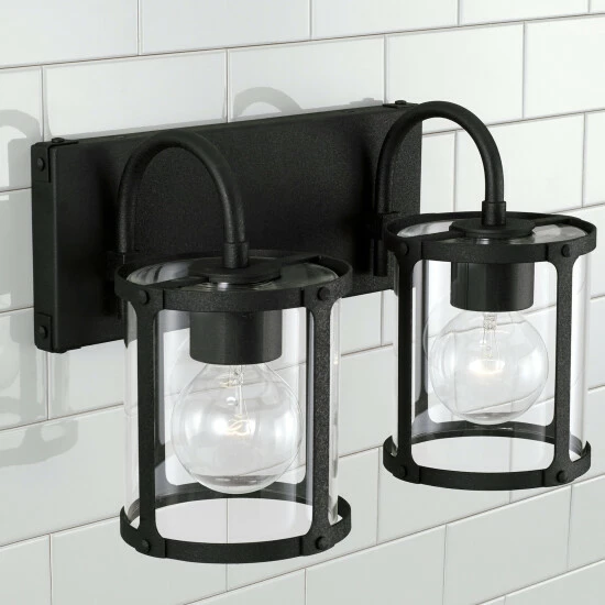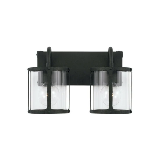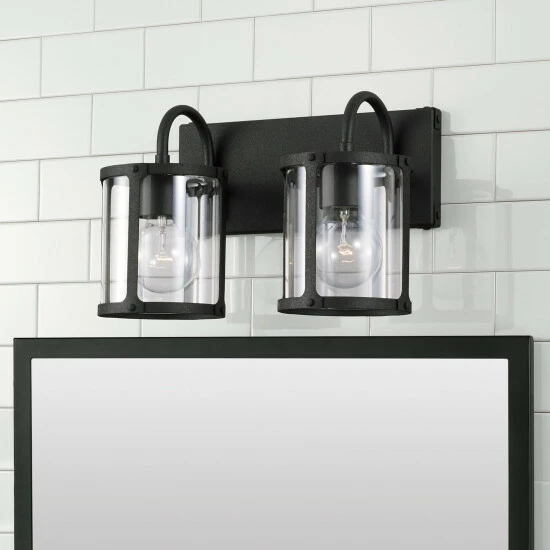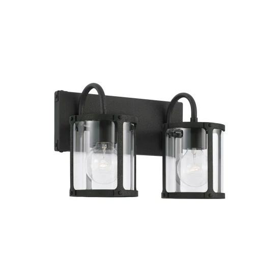 Bold lines and punctuated details create the Brennen 2-Light Bath/ Vanity. TheΒ Black Iron finish and rivet head accents provide a rugged, visual texture for industrial appeal and the clear glass panels soften the illumination. Also available in 3-Light or 4-Light.
