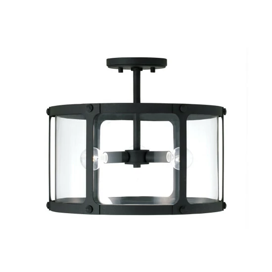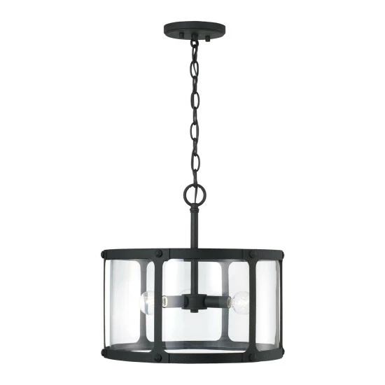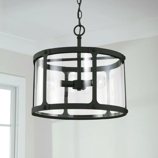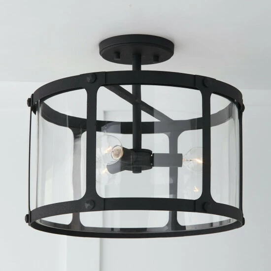 Bold lines and punctuated details create the Brennen dual mount. Whether hung as a pendant or a semi-flush, theΒ black iron finish and rivet head accents provide a rugged, visual texture for industrial appeal and the clear glass panels soften the illumination.