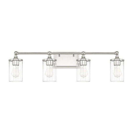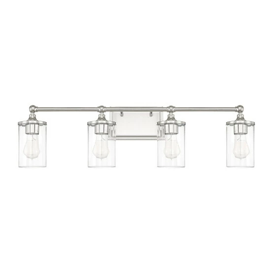 The Camden 4-light vanity keeps it fresh and airy. Modeled after a dowel, the slender, tubular frame is punctuated by ball accents and finished in Polished Nickel. Ribbed glass shades evoking flowing water and silk sheers lend texture to the light around your modern bathroom vanity.