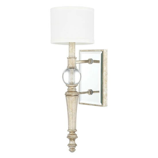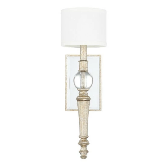 This Carlyle collection 1-light wall sconce features a beautifully hand painted gilded silver finish that will complement many traditional decors. The mirrored backplate and glass ball on the column add interest. The white fabric shade softens the light. Capital Lighting is a family owned business just outside Atlanta, Georgia. We pride ourselves by delivering high quality products at affordable pricing. Beginning with design concepts from popular home fashions, we transform our ideas into lighting fixtures that blend timeless beauty with today’s styling. From casting and forging to the hand painted finishes and fine details we strive to make our products the finest in the industry. Dimensions: 20.25 inches high x 6 inches wide x 7.75 inches deep.