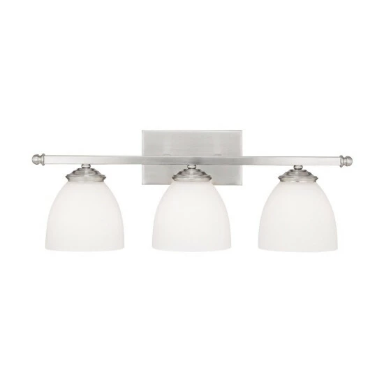 This Chapman collection 3-light bath/vanity light features a matte nickel finish that will complement many classic and traditional decors. The soft white glass softens the light and completes the look of this attractive design. Capital Lighting is a family owned business just outside Atlanta, Georgia. We pride ourselves by delivering high quality products at affordable pricing. Beginning with design concepts from popular home fashions, we transform our ideas into lighting fixtures that blend timeless beauty with today’s styling. From casting and forging to the hand painted finishes and fine details we strive to make our products the finest in the industry. Dimensions: 9 inches high x 24 inches wide x 7.5 inches deep.