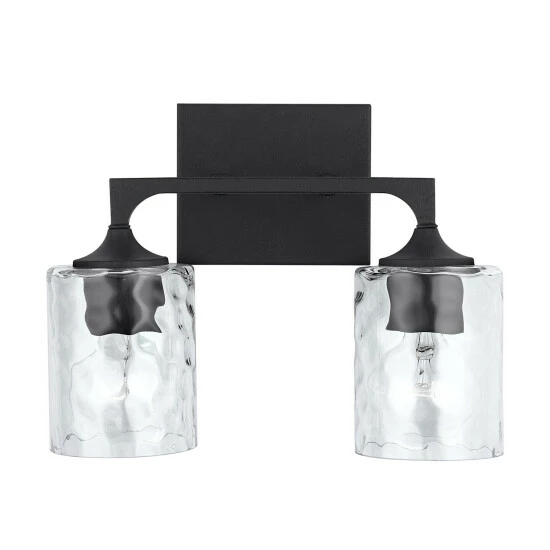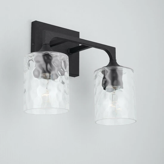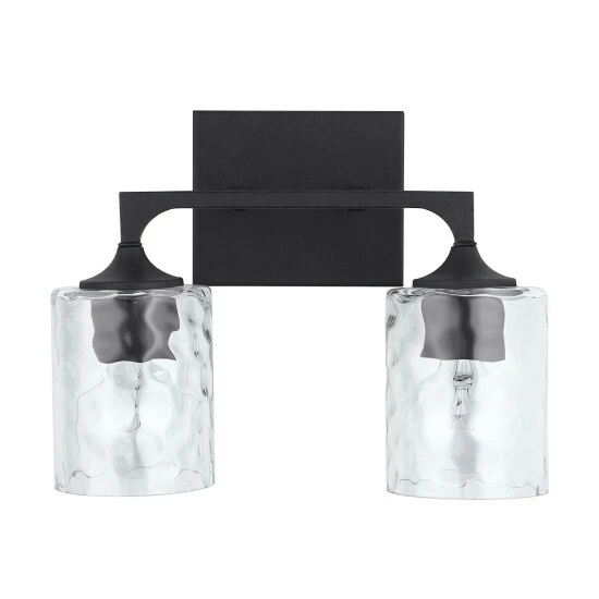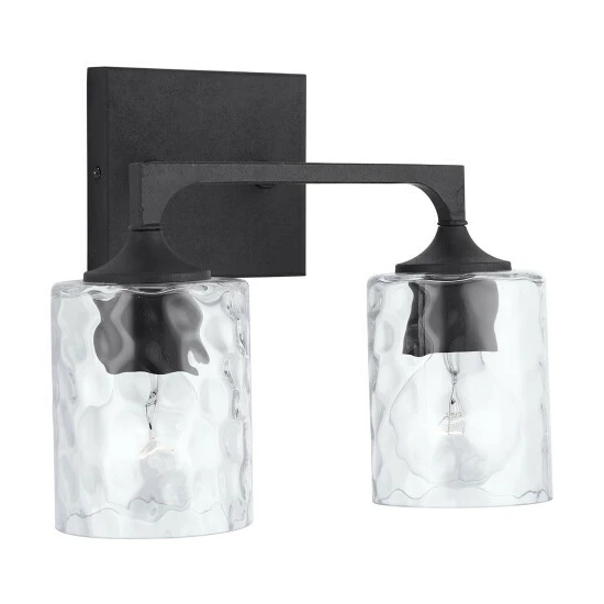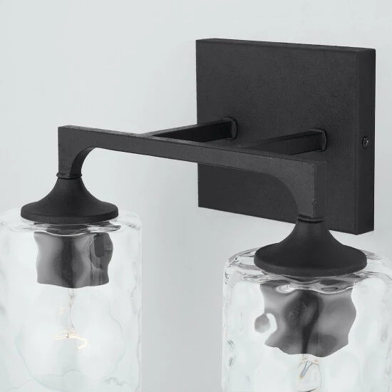 Understated, simple lines beautifully complement the bold prominence of the Black Iron finish on the Clint 2-light bath/ vanity fixture. The unique corner details of this transitional design are reminiscent of turn of the century style. Featuring dimpled water glass, this vanity is available as a 2-light or 3-light.