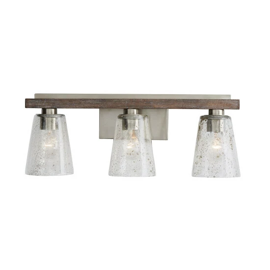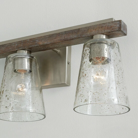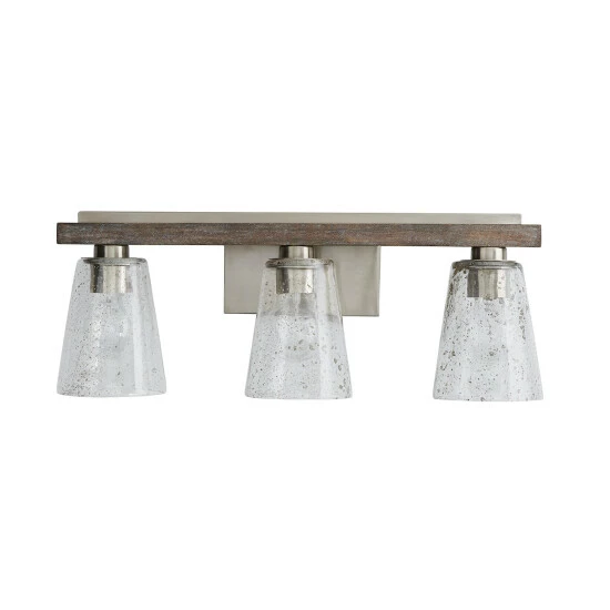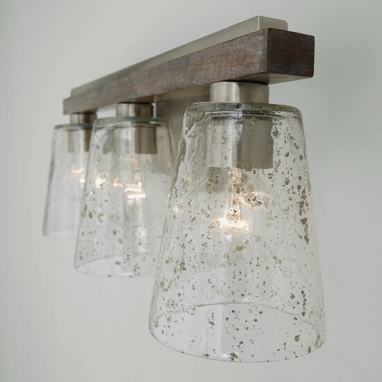 The simple cone shaped glass and minimal frame of this 3-Light Vanity paired with the natural handcrafted materials creates a refined rustic look. Hand-blown, stone seeded glass is paired with a handcrafted Mango wood frame. Slight variation may occur.