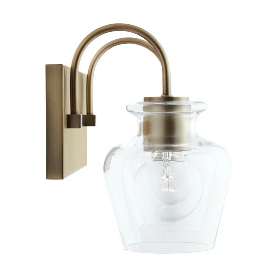 - Applications:Rated for damp locations, perfect for bathrooms and powder rooms. Clean arched arms are flanked by snifter-shaped clear glass to create a timeless look.