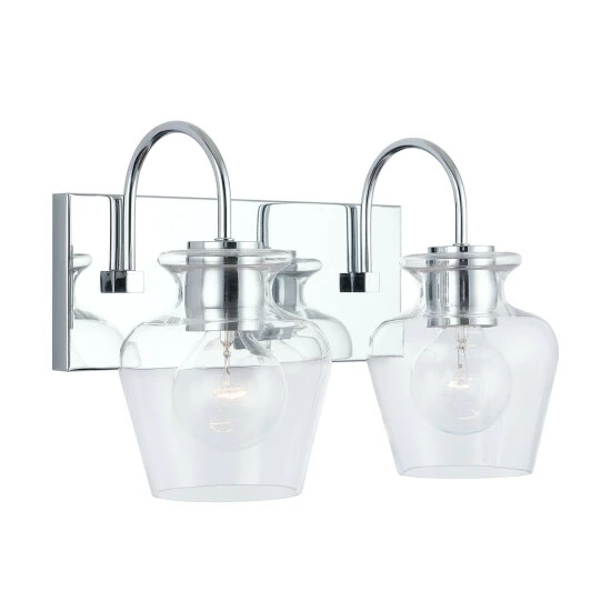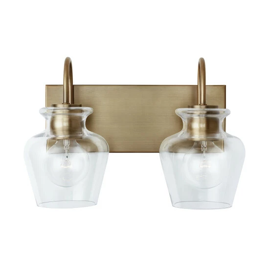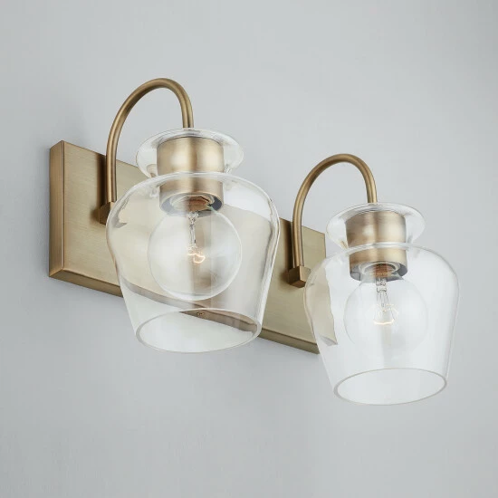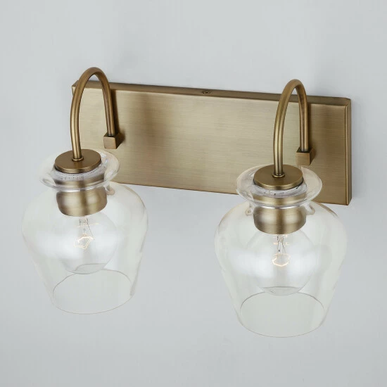 Clear glass shades hand-blown into simple silhouettes are accented by arched arms creating a modern or transitional look. Available in Aged Brass or Chrome as a 2-light or 3-light vanity.