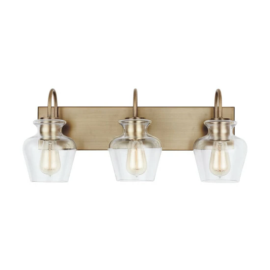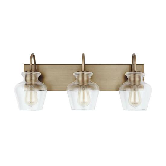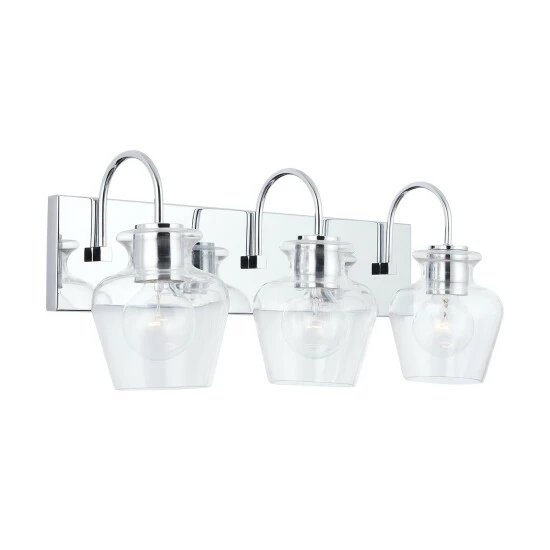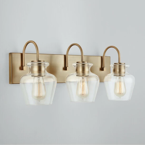Clear glass shades hand-blown into simple silhouettes are accented by arched arms creating a modern or transitional look. Available in Aged Brass or Chrome as a 2-light or 3-light vanity.