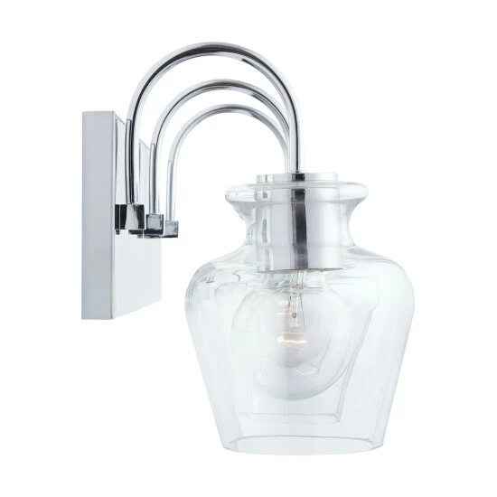 - Applications:Rated for damp locations, perfect for bathrooms and powder rooms. Clean arched arms are flanked by snifter-shaped clear glass to create a timeless look.