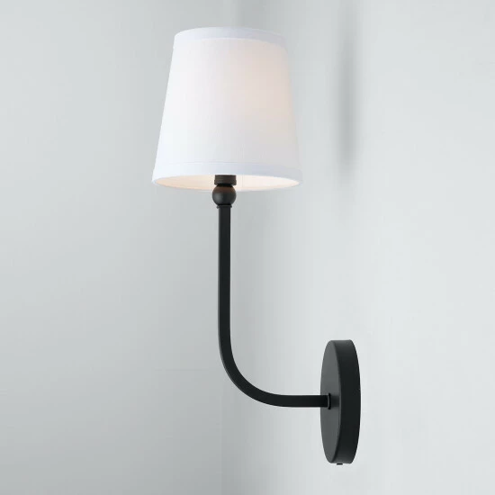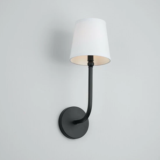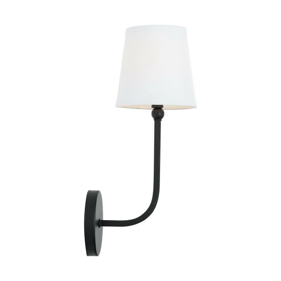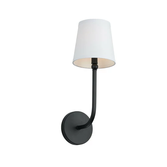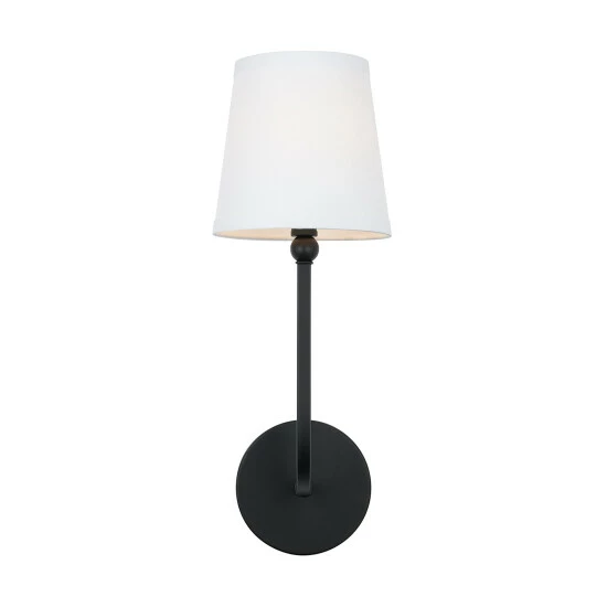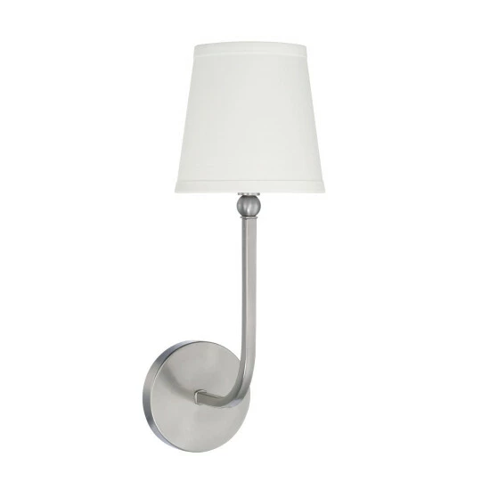 This Dawson collection 1-light wall sconce features a beautiful brushed nickel, aged brass, or matte black finish that will complement many traditional decors throughout your home. The decorative white fabric stay-straight shade softens the light completing this simple yet functional design.