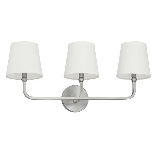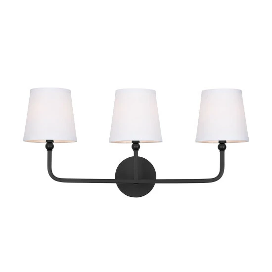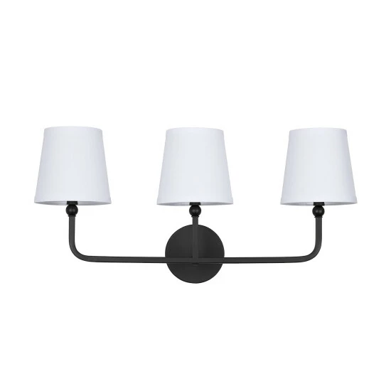 This Dawson collection 3-light bath/vanity fixture features a beautiful brushed nickel or matte black finish that will complement many traditional decors throughout your home. The clean lines of the frame add interest while the decorative white fabric stay-straight shades soften the light completing this simple yet functional design.
