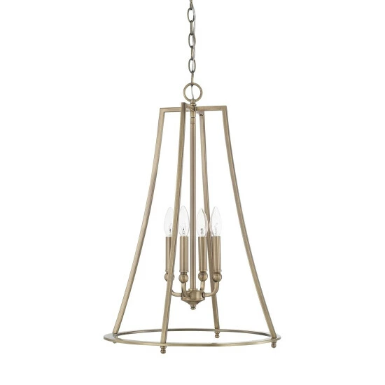 A trapezoidal tower-like frame houses four bulbs in the large Dawson 4-light foyer fixture. Great for creating an illusion of height above the staircase or in the foyer, this classic light fixture boasts gentle curves and ball accents for a touch of elegance. The Aged Brass finish lends itself to traditional, transitional or more modern settings.