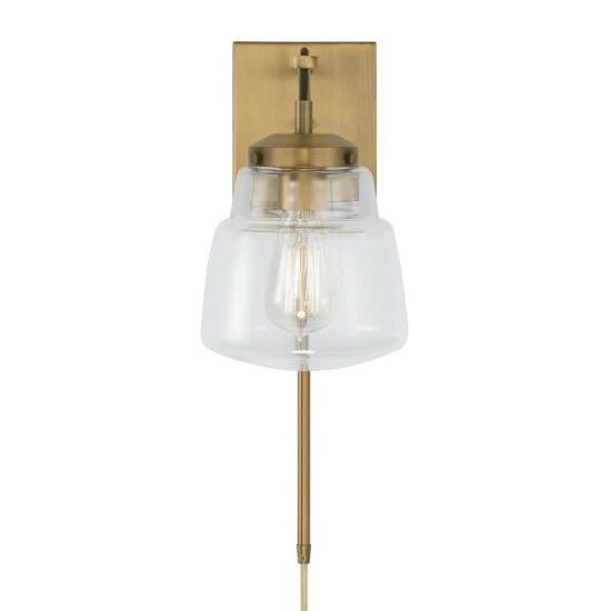 With a fresh spin on diner-inspired glass, the Dillon collection one (1) light wall sconce brings a refined retro vibe to any space. The Aged Brass and Matte Black finish accent the pronounced rivet details and sculptural silhouette of the plug-in optional fixture.