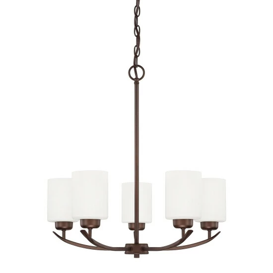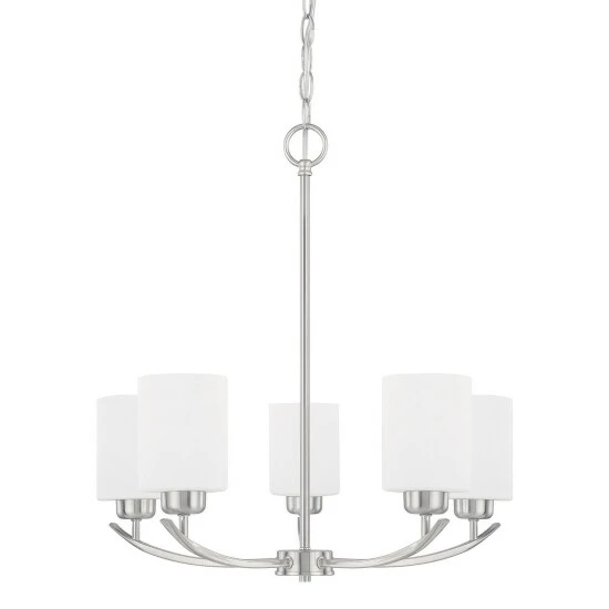 This 5-light chandelier from the Dixon collection is available in a brushed nickel or bronze finish that will complement many transitional and traditional decors throughout your home. The soft white glass shades soften the light creating a warm ambiance for many spaces.