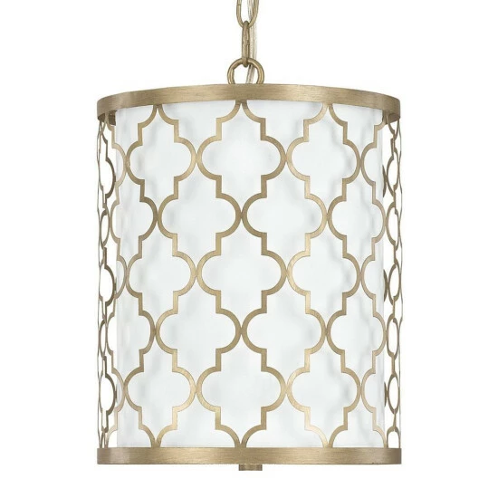 This Ellis collection five-light pendant with its brushed gold finish and white fabric shade will add interest to any room. This piece will complement many transitional decors. 60 inches of chain and 96 inches of wire included.