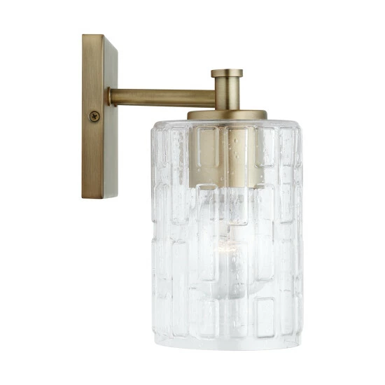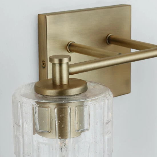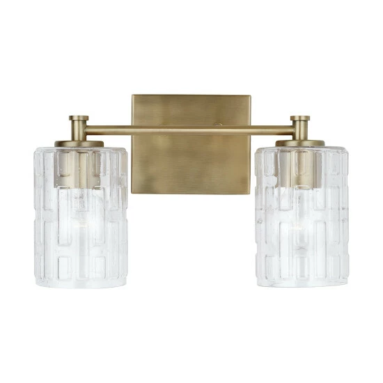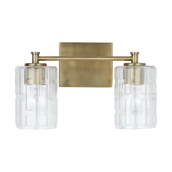 Seeded glass with an embossed geometric pattern sparkles on the Emerson 2-Light Vanity. The clean and classic frame is finished in Aged Brass and is available as a 2-light or 3-light.