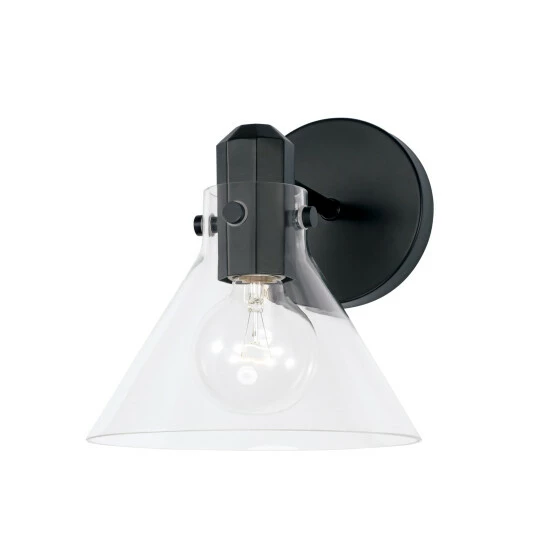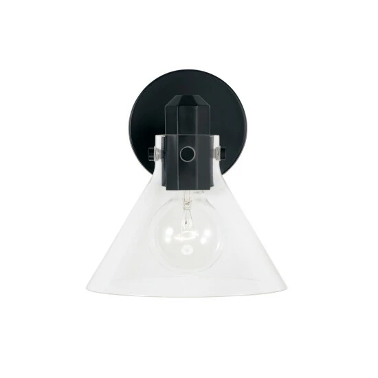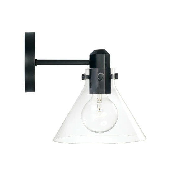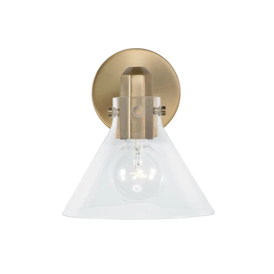 A modern take on midcentury style, the Greer Sconce brings understated style to any space. The faceted socket and rivet details add a pop of personality to the tapered glass.