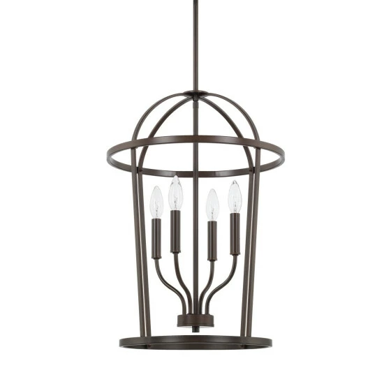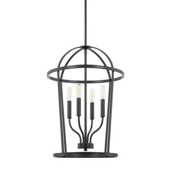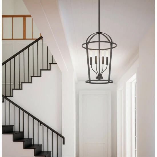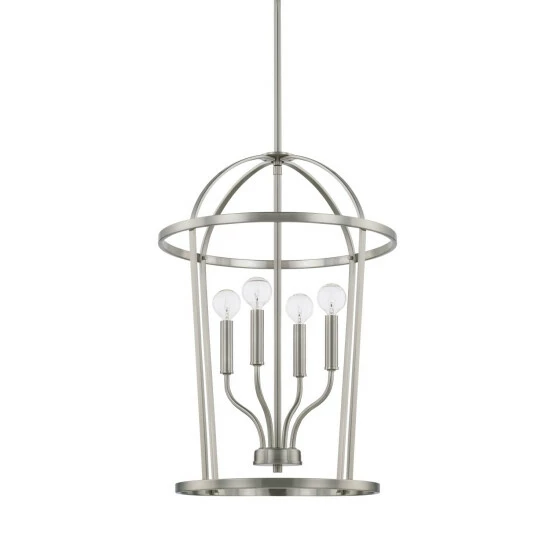 This 4-light hanging foyer pendant from the Greyson collection is available in 4 beautiful finishes. The aged brass, brushed nickel, bronze, or matte black finishes will complement a variety of decors throughout your home. The clean lines of the steel frame add interest while the exposed bulbs provide ample light to many spaces.