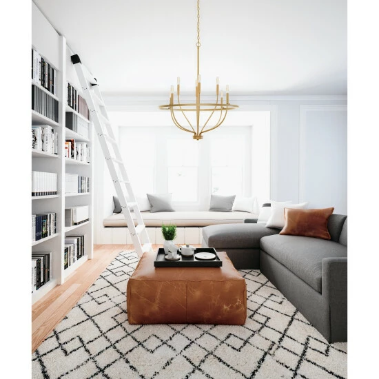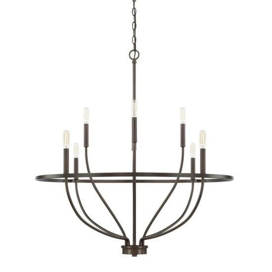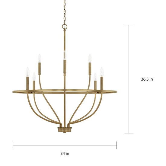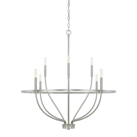 This 8-light, 2-tier chandelier from the Greyson collection is available in 4 beautiful finishes. The aged brass, brushed nickel, bronze, or matte black finish will complement a variety of decors throughout your home. The clean lines of the steel frame add interest while the exposed bulbs will provide ample light to many spaces..