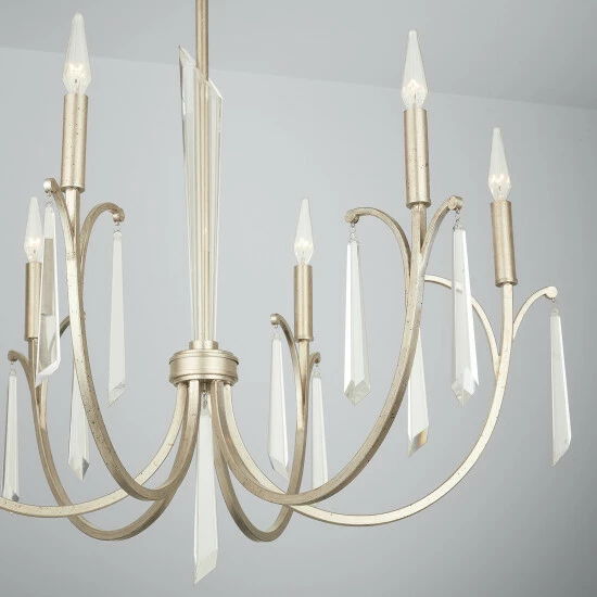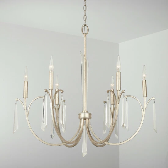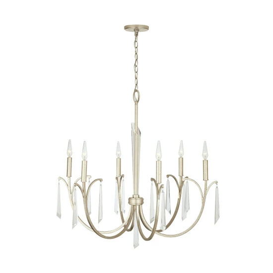 Layers of drama and opulence adorn the 6-Light Chandelier. The elongated prismatic crystals and metallic Winter Gold finish reflect hints of gold and silver that make this fixture work in a variety of settings.