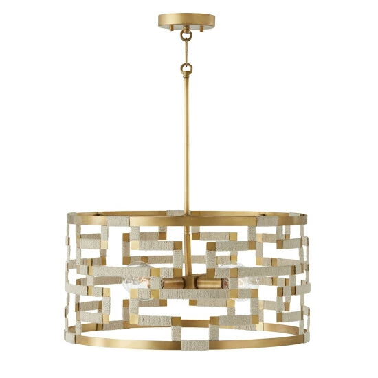 Bold and graphic pattern work command attention on this organic luxe Hala collection 4-light pendant. The hand-applied patina on the unique brass finish accentuates the Greek key inspired design, while the textured bleached natural jute rope softens the sharp edges.