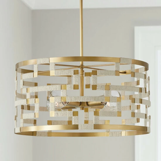 - Applications: Rated for dry locations, perfect for a hallway/stairway, foyer/entryway, kitchen, home office, dining room, living room or bedroom. Hand-wrapped natural jute accents the patinaed brass in this striking geometric pendant.