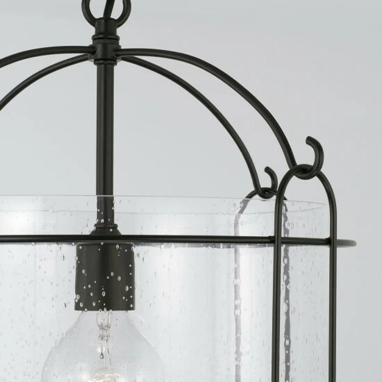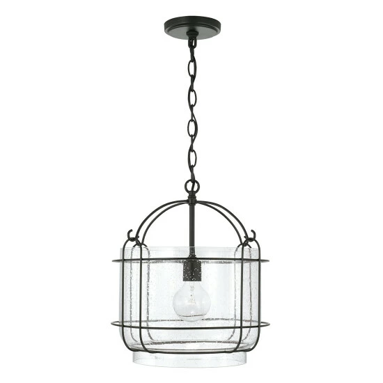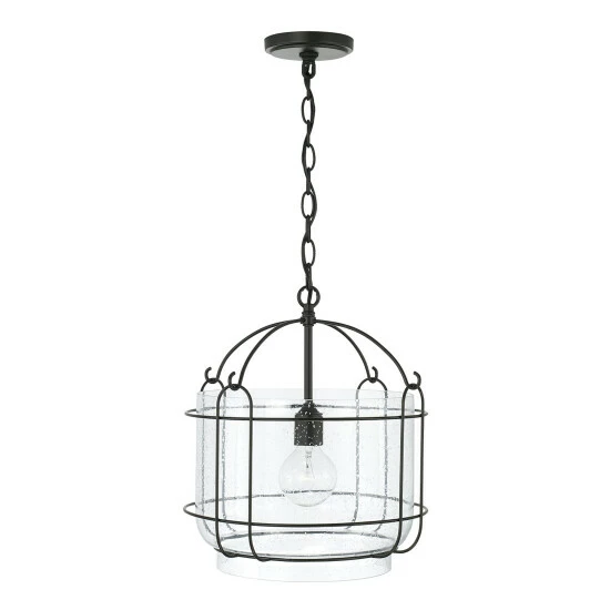 Inspired by a vintage walking lantern, the Harmon collection 1-light pendant evokes farmhouse flair. The seeded glass shade complements the classic Matte Black finish on the cage silhouette for a style that will stand the test of time.