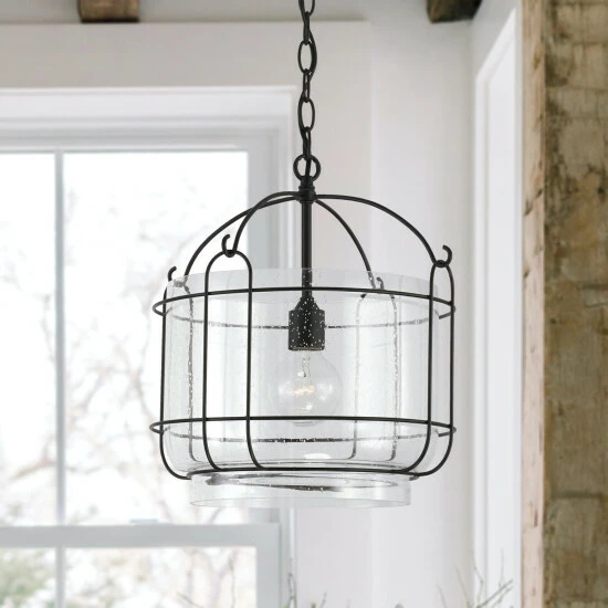 - Applications: Rated for dry locations, perfect for a hallway/stairway, foyer/entryway, kitchen, home office, dining room, living room or bedroom. Outfit an updated modern farmhouse looks with this suspended matte black cage design enclosing a conical seeded glass shade.