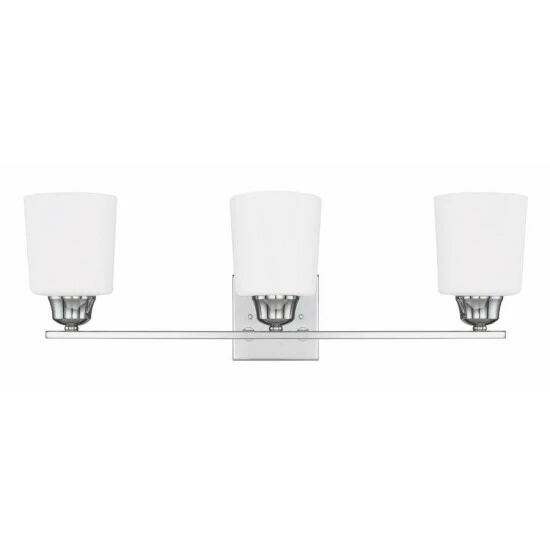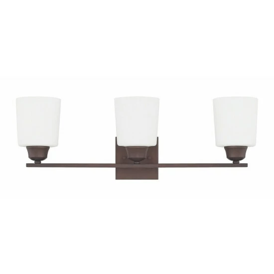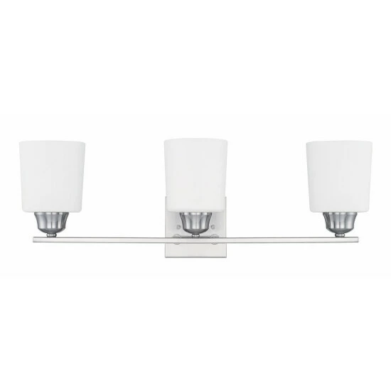 This 3-light bath/vanity light from the Hayden collection is available in a brushed nickel, bronze, or polished nickel finish that will complement many transitional and traditional decors throughout your home. The clean lines of the steel frame add interest while the soft white glass shades soften the light creating a warm ambiance for many bathroom spaces.