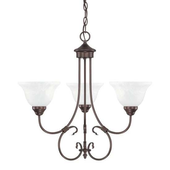 This elegant 3-light fixture features a stylish bronze or matte nickel finish. A white faux alabaster glass shade accents the look for an updated style to any decor.