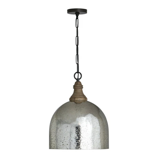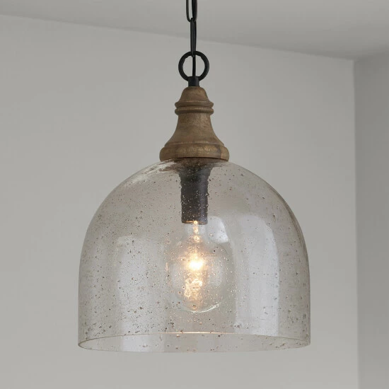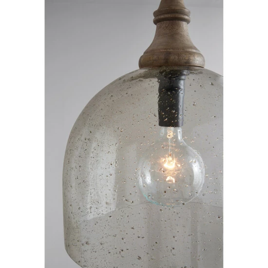 This handcrafted light pendant with rippled glass and mango wood finial shines light on organic style, catering to the craving for artisanship.