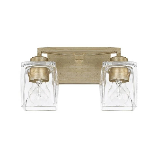 This Karina collection 2-light bath/vanity fixture features a beautifully hand painted winter gold finish that will complement many urban and transitional decors throughout your home. The clean lines of the frame add interest while the clear faceted glass shades provide a unique look to the light, enhancing many spaces.